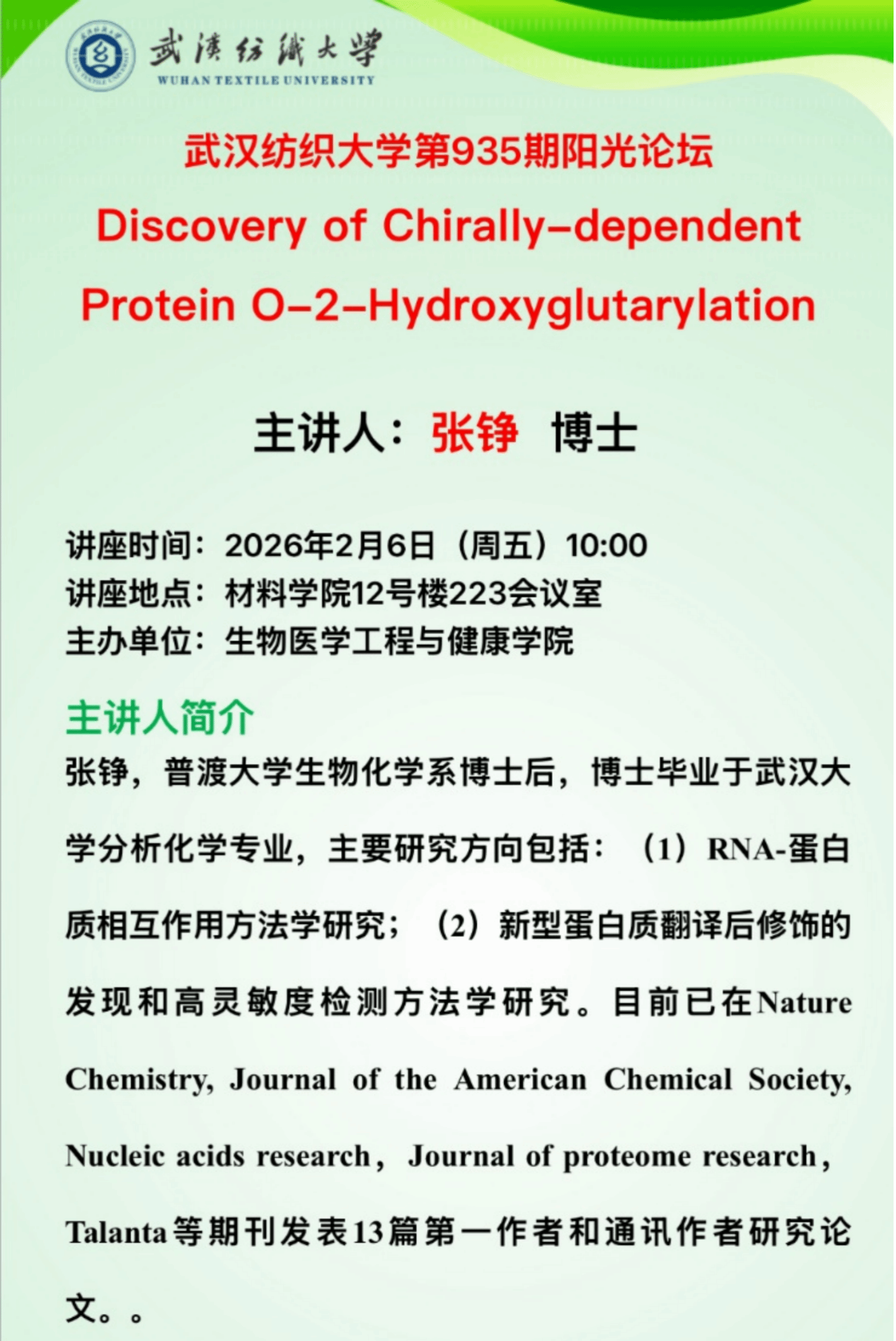 应武汉纺织大学生物医学工程与健康学院冯钰锜教授邀请,普渡大学生物化学系博士后张铮博士于2026年2月6日上午,在材料学院12号楼223...
