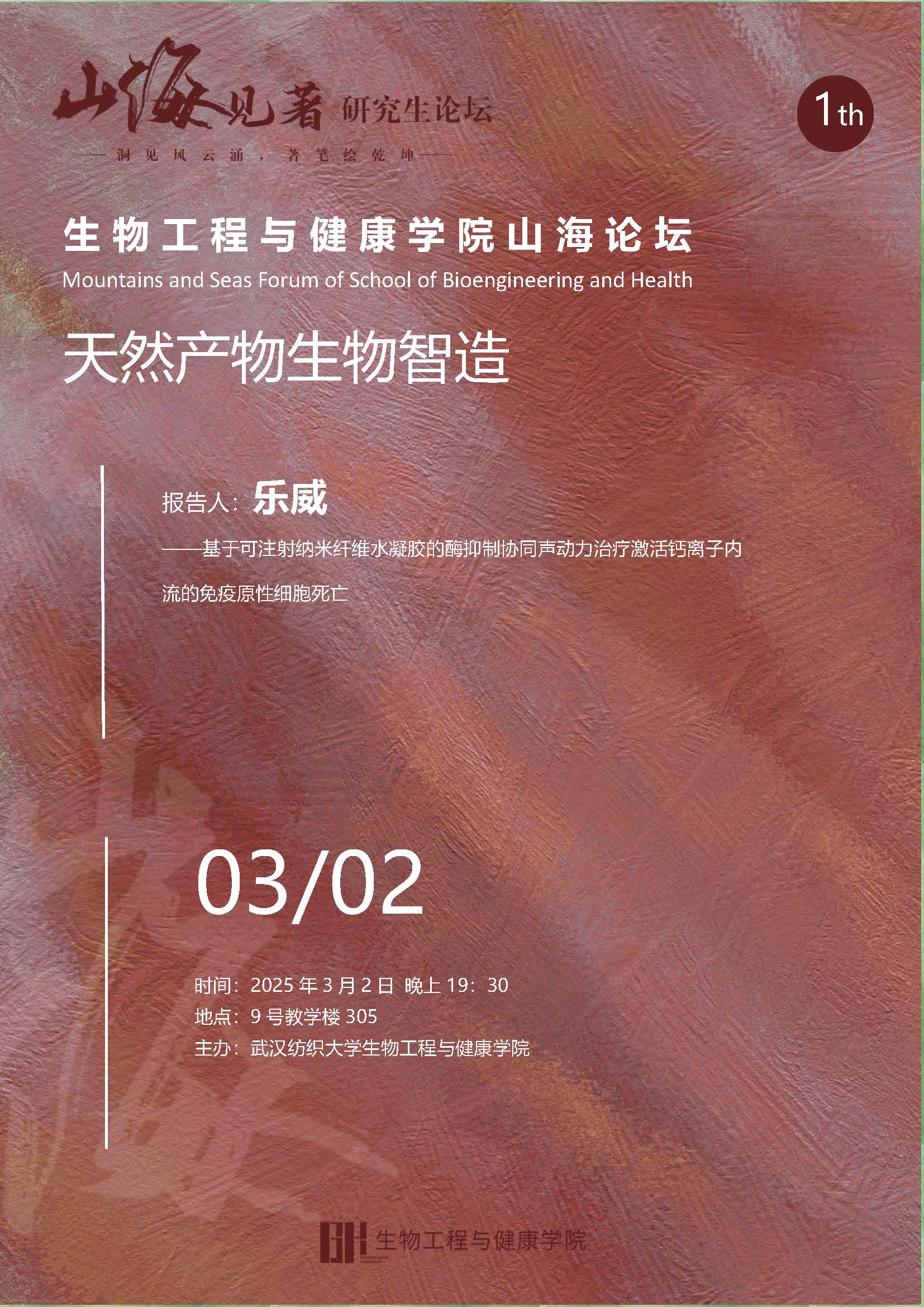 3月2日,太阳城(在线)娱乐官方网站 主办的“山海论坛”在学校9号教学楼305教室举行。本次论坛主题为“天然产物生物智造”,由乐威同学带来题为《基于可注射纳米纤维水凝胶的酶抑制协同声动力治疗激活钙离子内流的免疫原性细胞死亡》的学术报告。