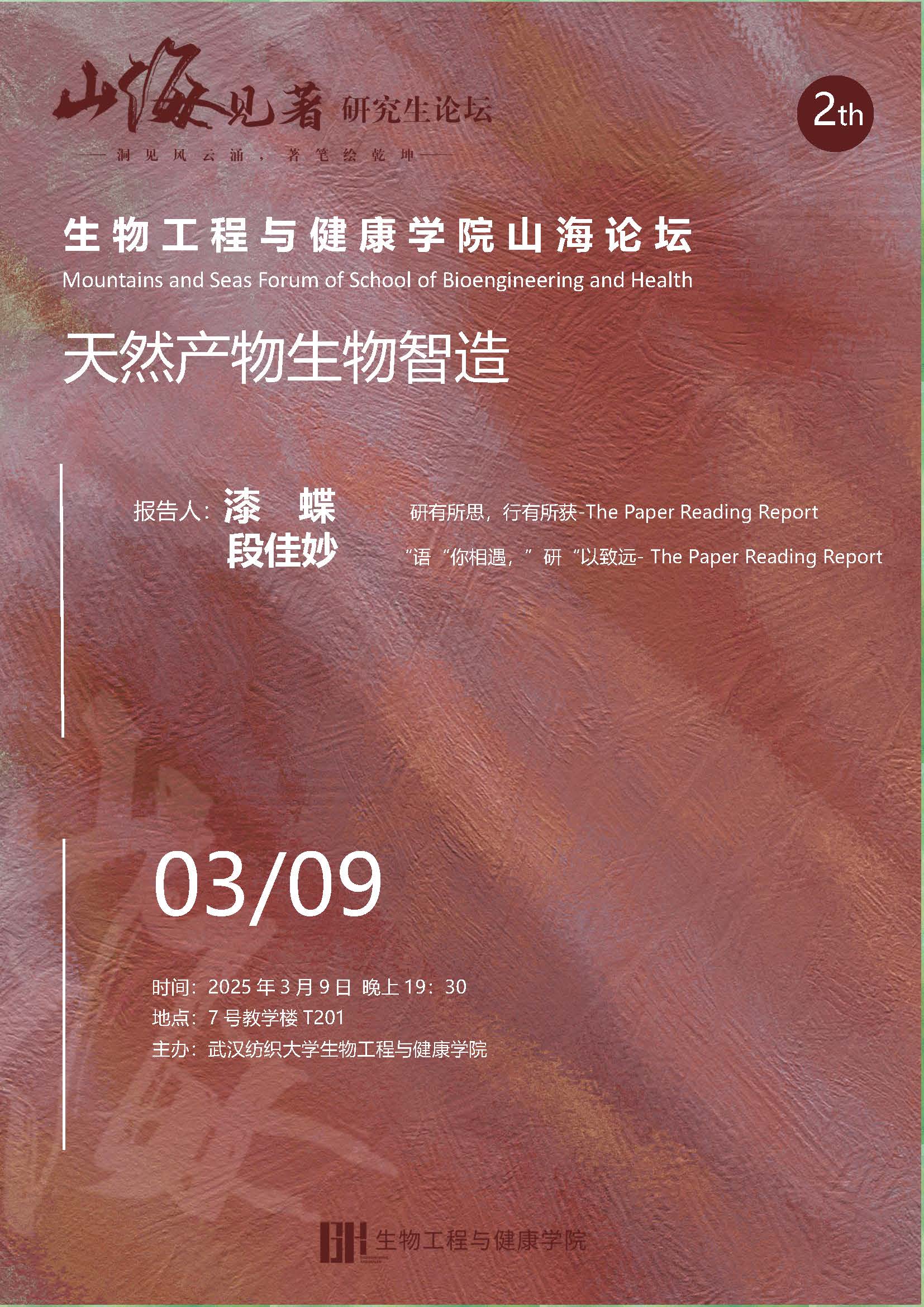 主办的学术活动“山海论坛”于7号教学楼T201教室顺利召开。本期论坛延续“天然产物生物智造”的主题,由漆蝶、段佳妙两位同学作专题报告,主题分别为“研有所思,行有所获”与“‘语’你相遇,‘研’以致远”。