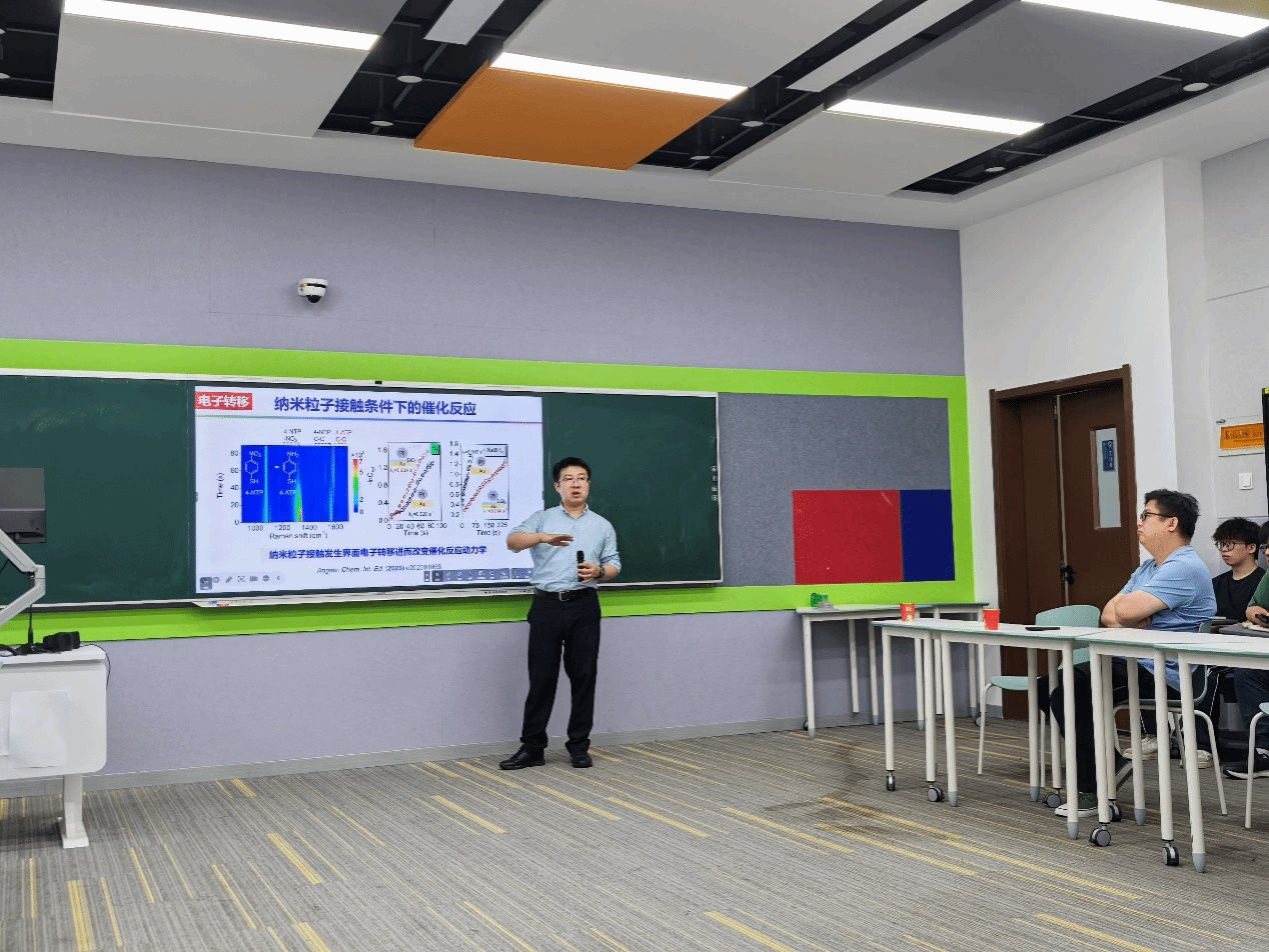 报告中,谢教授作题为“纳米颗粒表面化学反应的增强拉曼光谱测量研究”学术报告,介绍了纳米颗粒多相催化反应在固/液或固/气界面的催化反应机制,纳米颗粒表面是一个多相多组分相互交错的复杂区域,物质分布不均匀且物种结构动态变化,对其进行观测十分具有挑战性,谢教授团队以表面增强拉曼光谱(SERS)为检测手段,设计合成了“核-卫星”双功能SERS增强基底来监测纳米颗粒催化剂表面化学反应过程,实现了多种类型催化反应的SERS检测。提问环节,谢微教授就拉曼技术与本实验室课题相关应用与在场师生进行了深入交流。