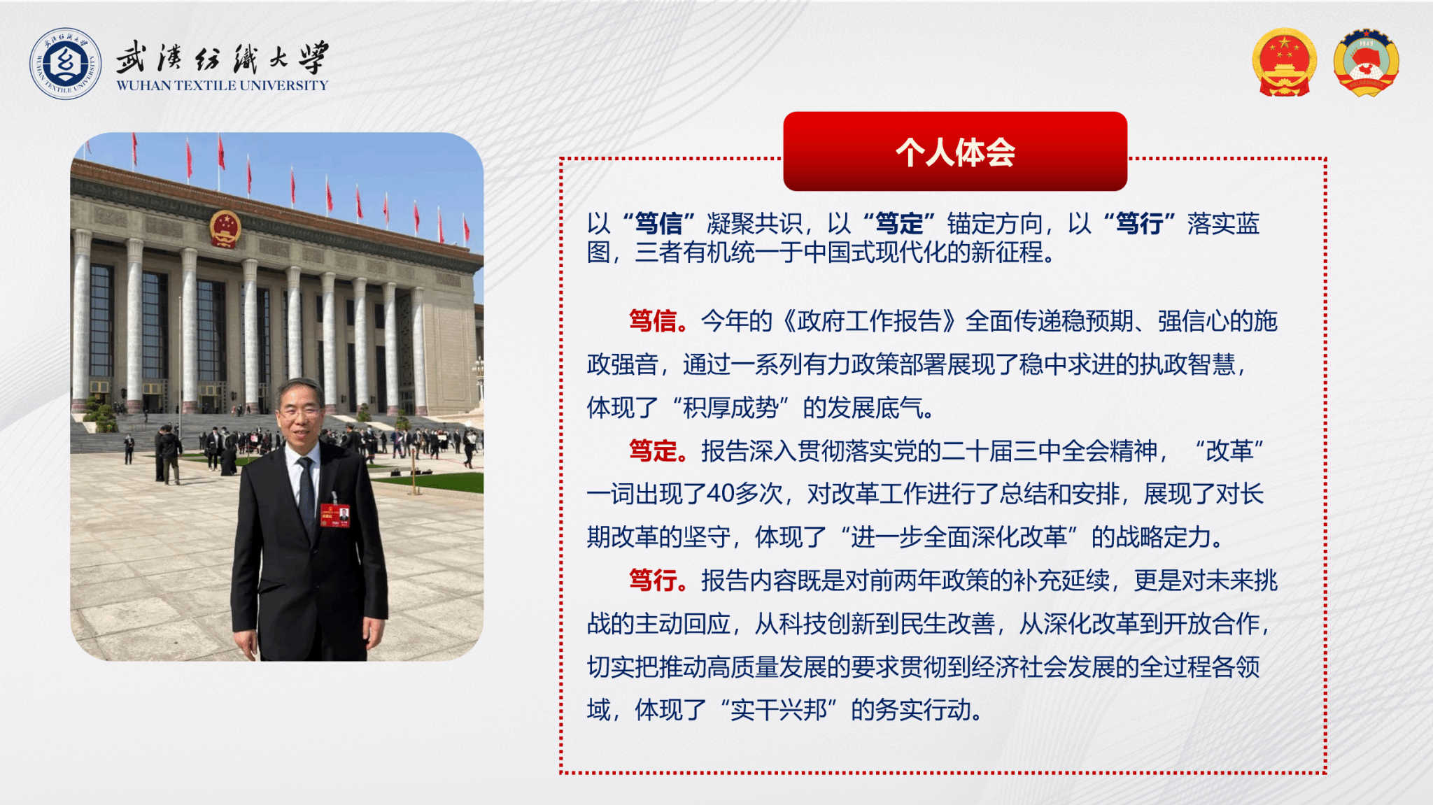 理论专题学习阶段,李楠书记传达学习学校关于贯彻2025年全国两会精神,全国人大代表、中国工程院院士、校长徐卫林的《锚定目标 真抓实干 奋力开创一流学科建设新局面》专题辅导报告。报告指出,2025全国两会以“笃信”凝聚共识,以“笃定”锚定方向,以“笃行”落实蓝图,全面传递稳预期、强信心的施政强音,体现了“积厚成势”的发展底气,体现了“进一步全面深化改革”的战略定力,体现了“实干兴邦”的务实行动。报告中,徐卫林同志作为全国人大代表在履职工作中提交了5项建议议案,重点关注智能纺织材料、人工血管及血管替代物、国家科技奖励评审机制、免试攻读研究生、高校产业兼职教师等方面。