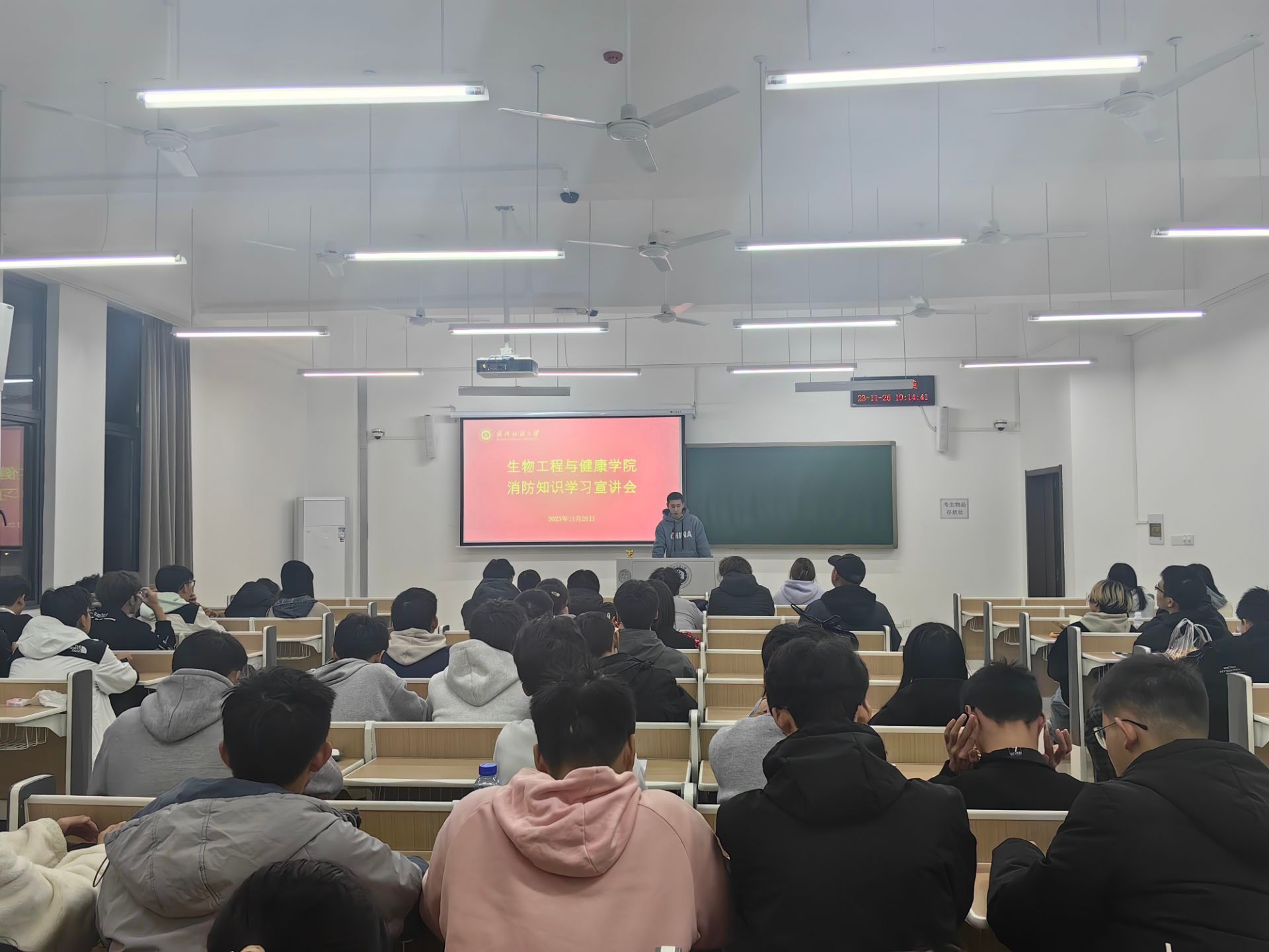 本次学习宣讲由兼职辅导员沈忱带头,为大家详细讲解消防安全知识,包括应对火灾、突发事件的自防、自救等。