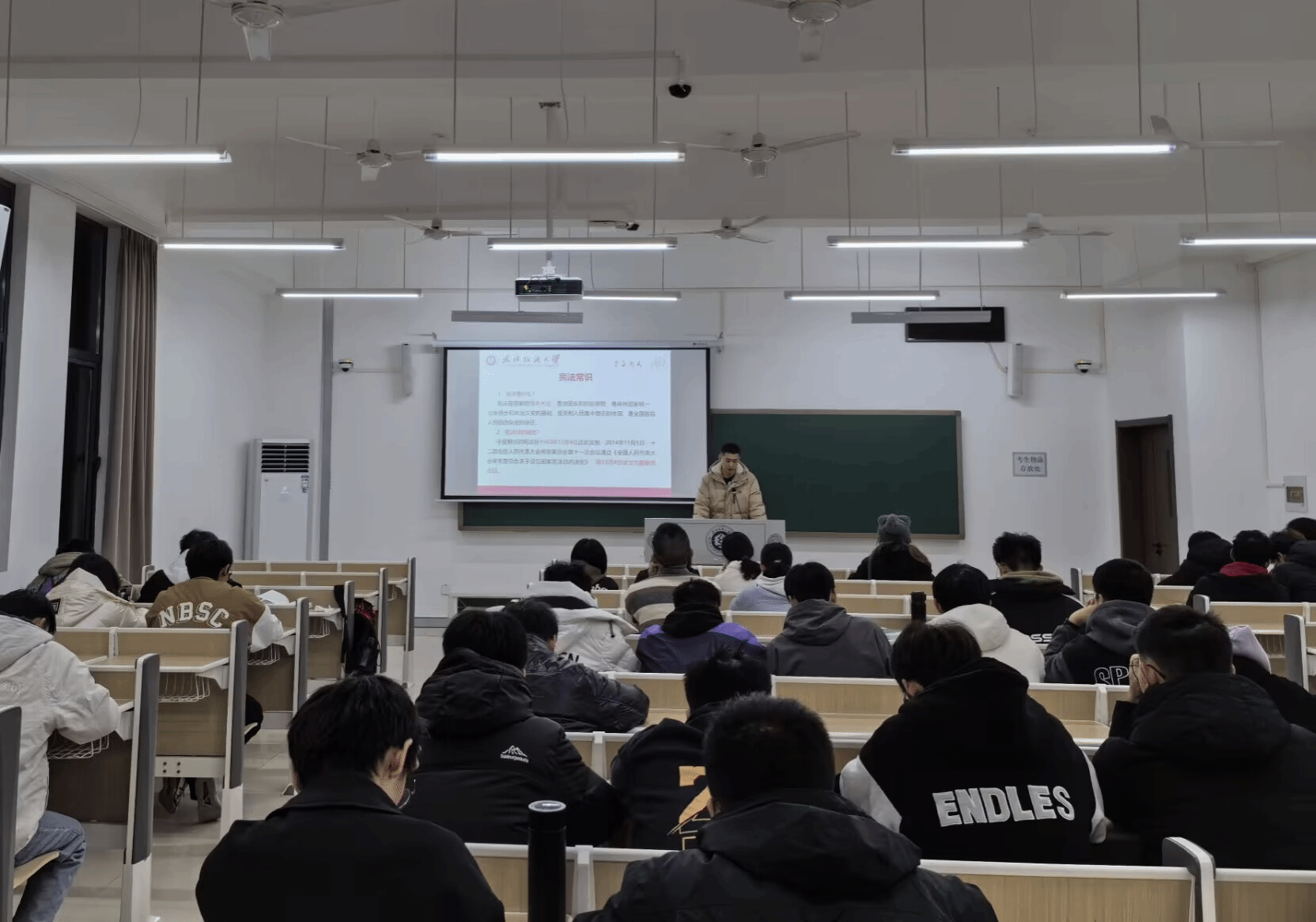 在大会上,沈忱为同学们讲解了有关宪法的基本常识,内容涵盖宪法的起源、宪法的主要内容以及公民的基本权利和义务等方面。通过生动的案例分析和互动讨论,学生们深入了解了宪法对于国家治理、社会稳定和公民权益保障的重要作用。