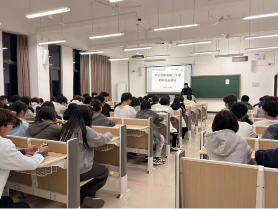 于7-T102教室召开主题为“学习贯彻党的二十届四中全会精神”的年级大会,本次大会由辅导员朱一雷老师主持,2025级全体学生共同参与。