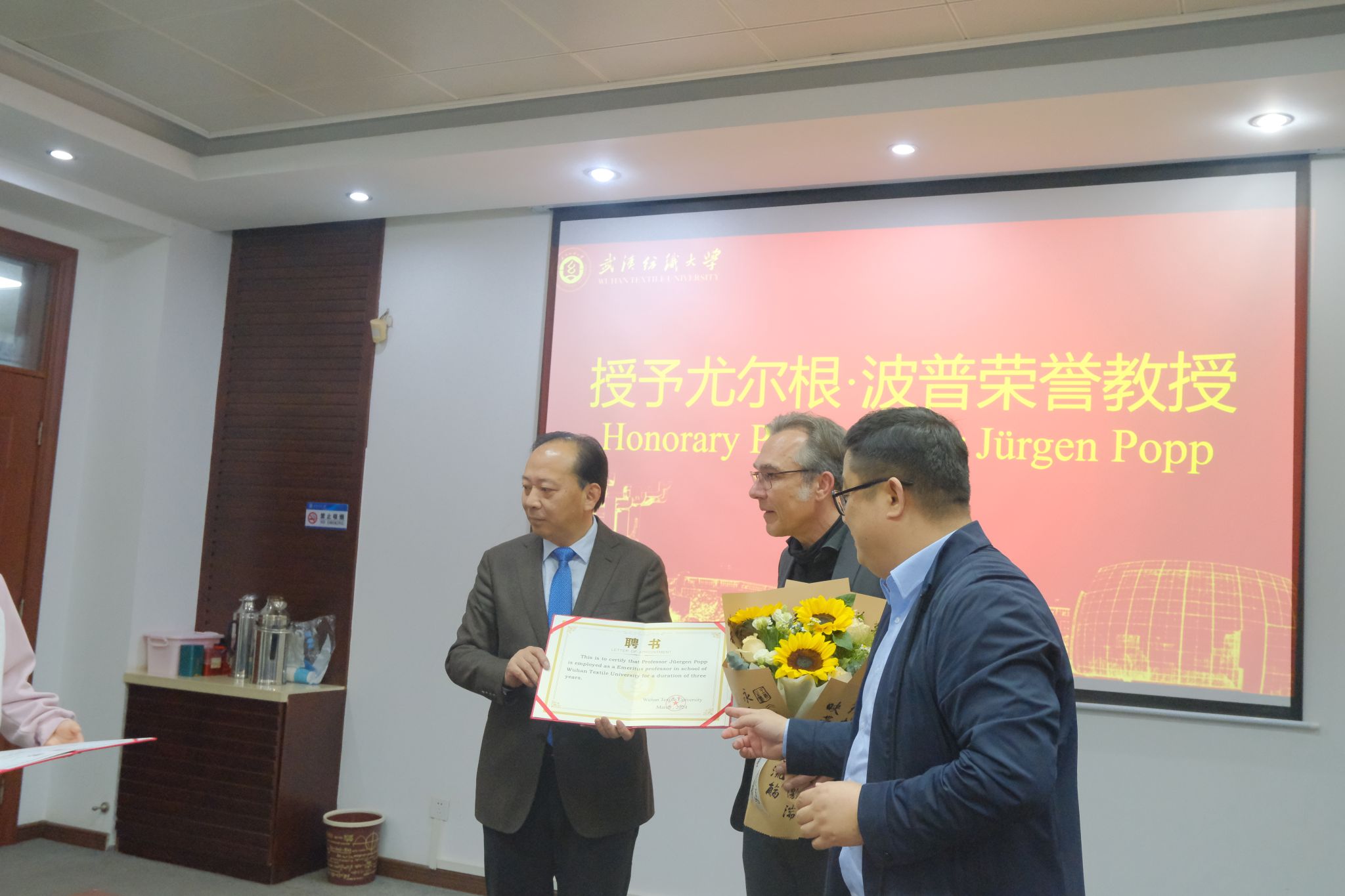3月27日上午,武汉纺织大学荣誉教授聘任仪式暨国际学术报告会在阳光校区行政楼112会议室举行。来自德国弗里德里希-席勒-耶拿大学Jürgen Popp教授受聘为我校荣誉教授。副校长冯军携人事处、国际处负责人、太阳城(在线)娱乐官方网站