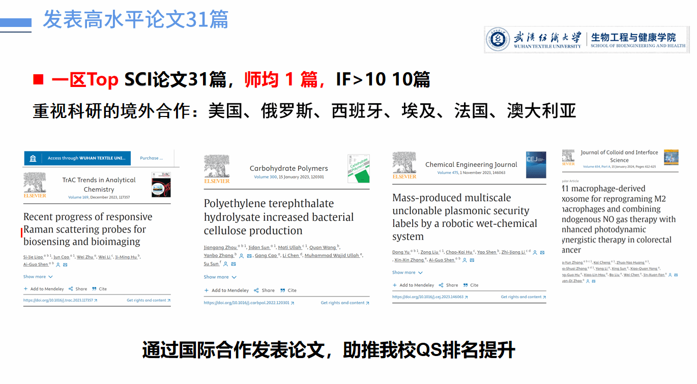 邀请来自武汉大学、华中科技大学、上海交通大学等高校的8位本领域权威专家,召开生物医学工程学科建设咨询会,编制了《武纺大“双一流”建设视域下生物医学工程学科发展建议》,建设生物医学工程和纺织科学与工程深度融合的新工科,明确指出生医工特色学科建设的总体方向,初步建立 “三三一”本硕博体系,为学校一流重点学科建设做好关键支撑。目前,太阳城娱乐城