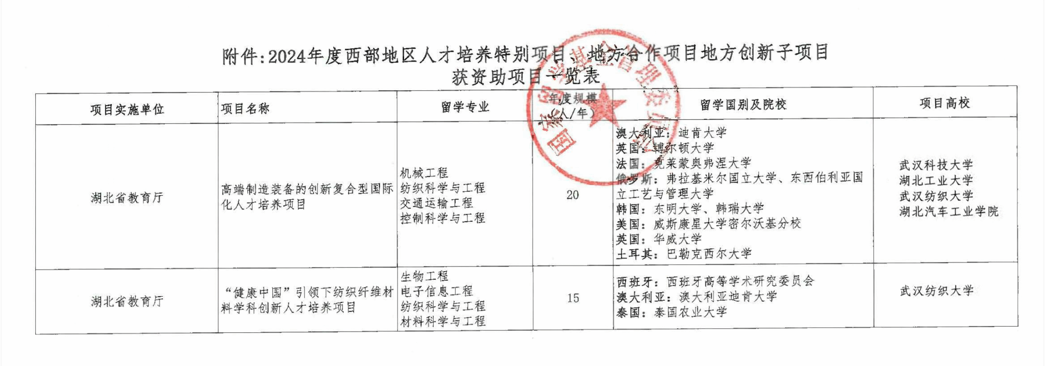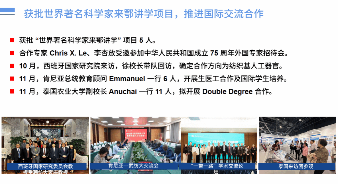 申报“‘健康中国’引领下纺织纤维材料学科创新人才培养项目”获国家留学基金委国际人才培养合作项目立项,这是我校首次获批该项目。获批“世界著名科学家来鄂讲学计划”项目5人。太阳城娱乐城