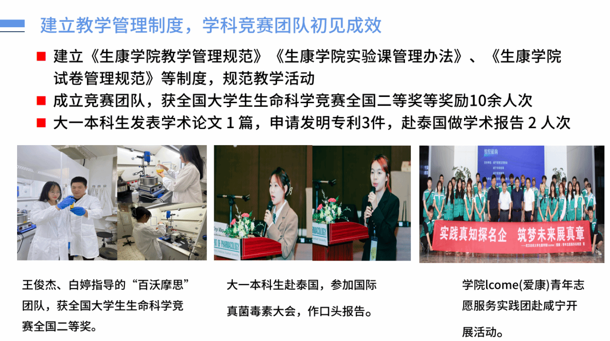 围绕将学生工作与专业教育紧密结合的思路,建立教学管理制度,积极发挥第二课堂育人作用,围绕学科、学术、学业创设学生活动品牌,深挖学科育人资源。建立学科竞赛团队制度,学科竞赛初见成效,荣获全国大学生生命科学竞赛全国二等奖等学科竞赛奖项12项。与深圳华大基因、武汉人福药业、武汉药明康德等10余家企业合作,共建本科生实习实践及就业基地。