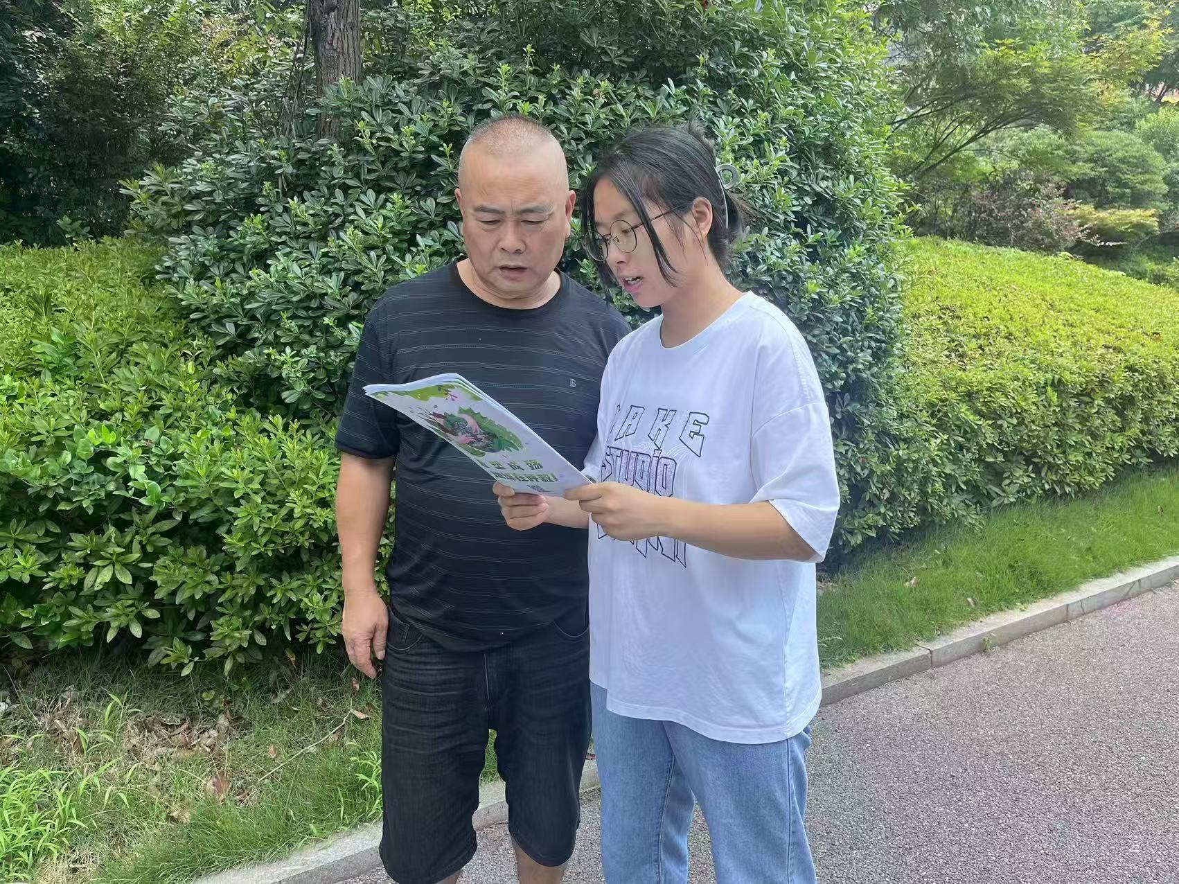 仪式结束后,志愿者与社区居民携手参观社区文化长廊。长廊内陈列的汉绣、扎染等精美手工艺品,均由志愿者与社区居民共同创作完成,飞针走线间传承非遗文化,斑斓色彩中凝聚邻里温情,成为社区一道亮丽的文化风景线。居民们亲身体验手工制作,一针一线间,传统艺术不再是博物馆里的“静态展品”,而是社区生活中“可触摸、可参与”的文化体验。从图案设计到手工实操,居民们在互动中感受非遗魅力,学生也在文化传承实践里,深化对传统文化创新传播的思考,让校社文化交流实现“双向奔赴”。